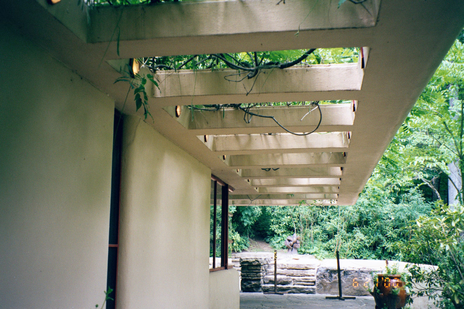 Though naturally unassuming, the guest house trellis is the longest cantilever at Fallingwater, drawing one from the top of the canopied steps (that lead up the hill from the main house), across the length of the front wall of the guest house (visible on the left in this photo), and on to the steps in the photo (bottom center) that take one over the wall of the guest house plunge pool. Making use of a device Frank Lloyd Wright would often use to suggest a reduction in the barrier between inside and outside, the corner window at the end of the front wall has no vertical corner post. |