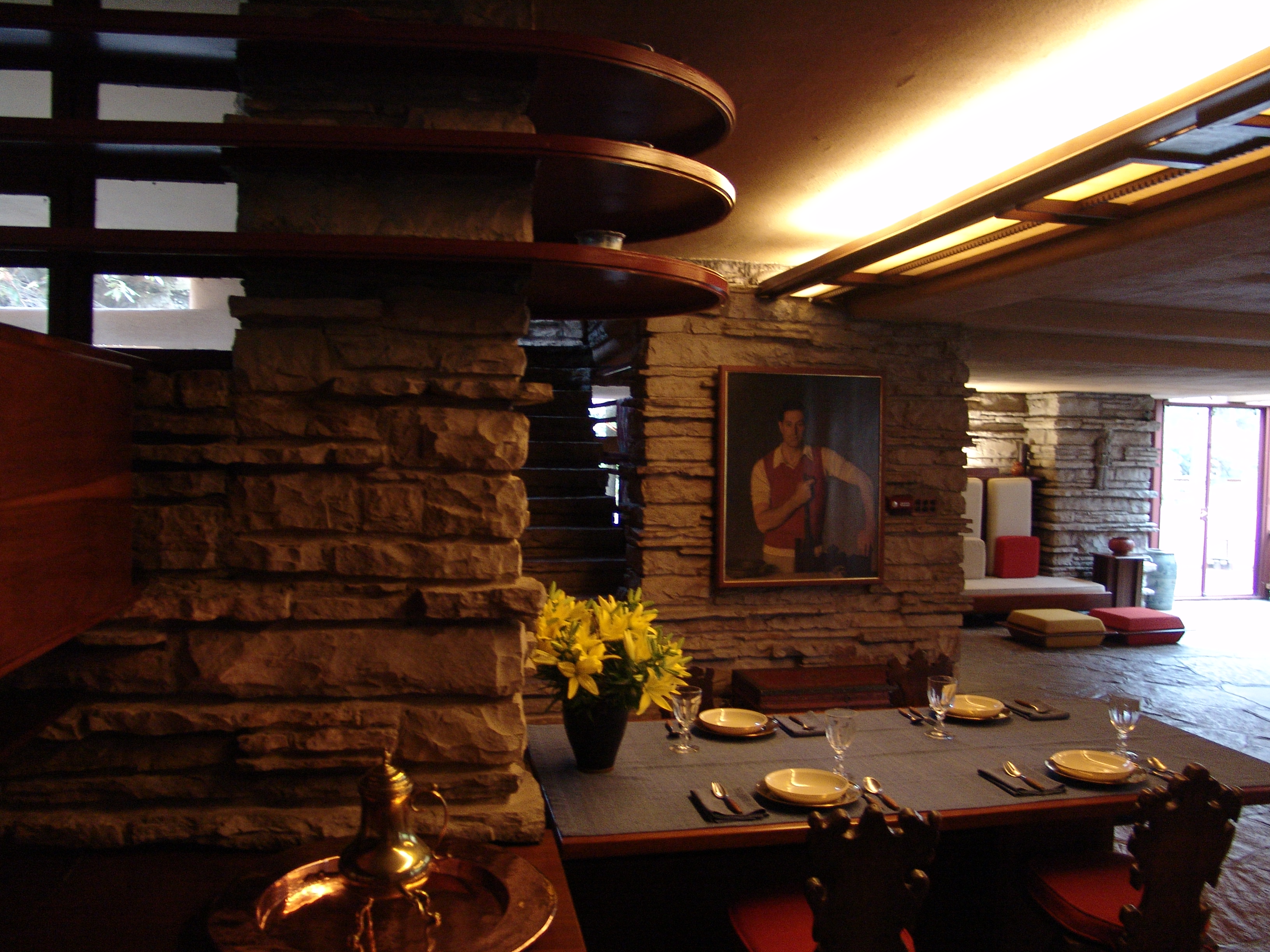 This view is from the kitchen doorway in the northwest corner of the living room. The portrait hanging on the wall is of Edgar Kaufmann, Sr., who hired Frank Lloyd Wright to design the house in 1935. The house then passed to Edgar Kaufmann, Jr., who had studied under Wright at Taliesin. In 1963 he made the house available to the public by entrusting it to the Western Pennsylvania Conservancy.