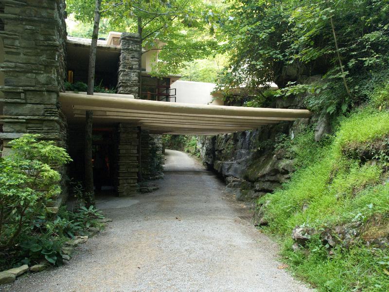 The photographer has just crossed the bridge over the stream (Bear Run) and immediately turned to his left. The entrance to the house is on the left in the photograph. Visible over the driveway are a trellis and, behind it, the corridor connecting to a covered walkway that meanders down the hill from the guest house (to the right of this picture). The main door is tucked away in a short corridor behind the bush on the left. Click here for a similar photo in a larger size. |
